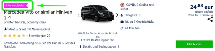Der Intui Recommend-Marker kennzeichnet die Angebote einiger der besten Transportunternehmen. Das Beste in Bezug auf die Servicequalität. Zuverlässig und keine Beanstandungen. Auf der Strecke kann es mehrere solcher Angebote geben. Wir empfehlen, ein Auto bei Intui Recommend zu buchen!