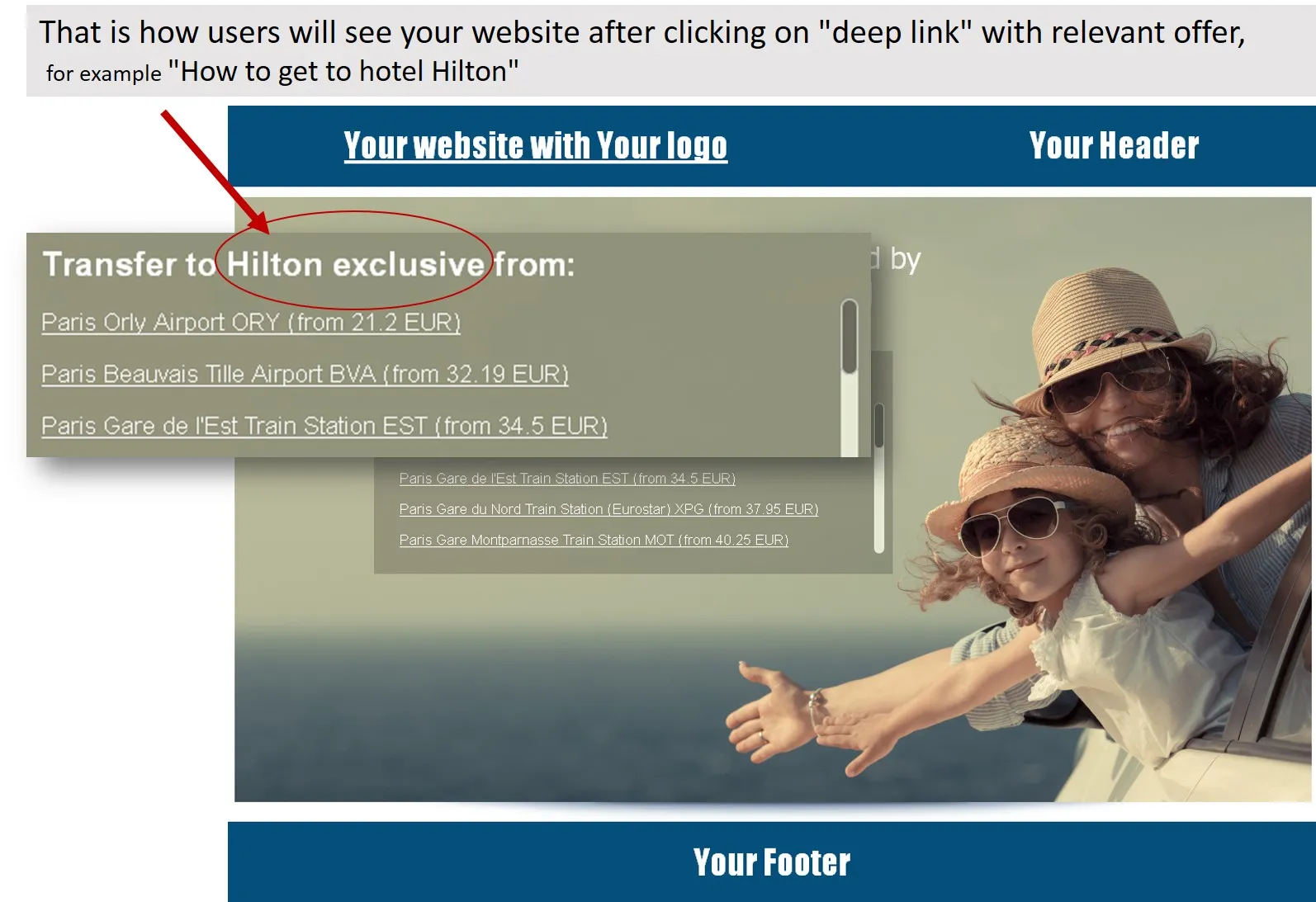Solution with white label + deep link allows user to stay on your domain! Your customer makes a booking of transfers on your site.