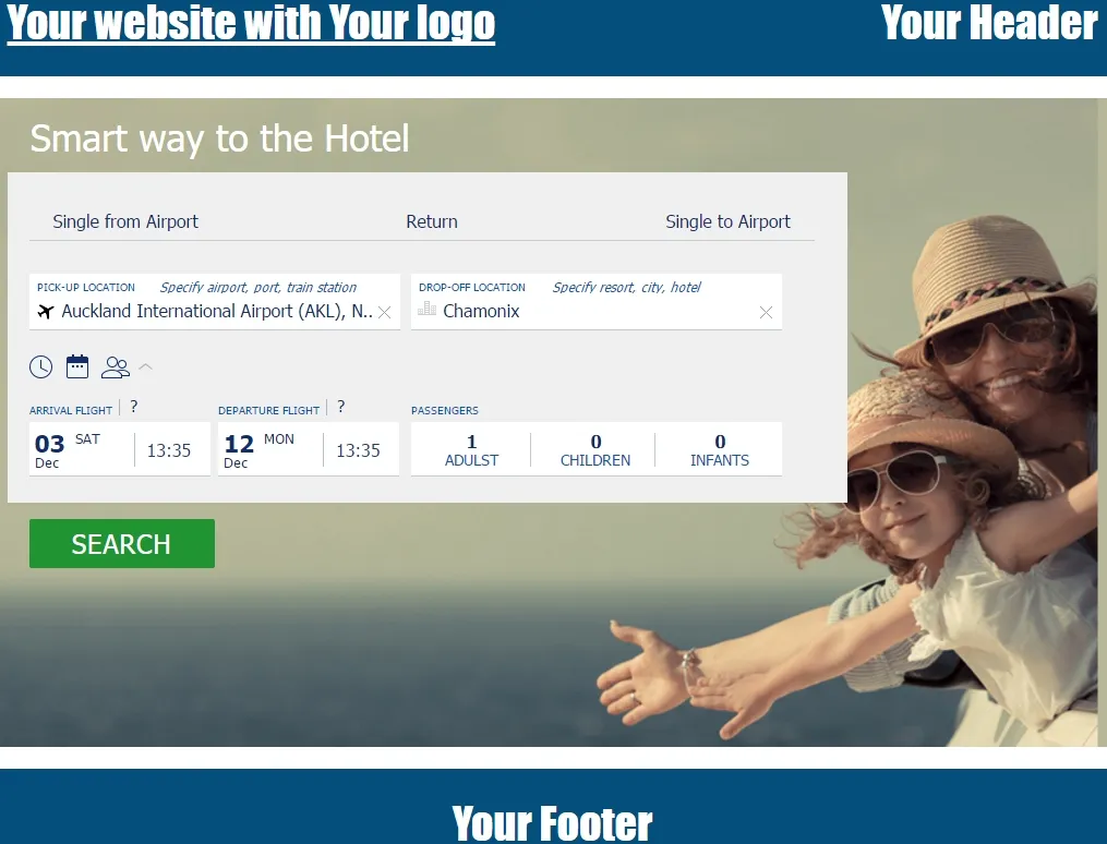 Implementation of white label on your subdomain allows to integrate the interface of booking from selection up to payment option on your site. At the same time, your header and footer stay on your site! In this way, from selection up to payment option of transfers - all that your customer makes under your logo.