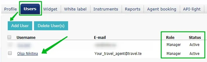For example, there are several sales managers in Agency, IT specialist at outsourcing, head-manager - he is also the owner. Head-manager receives full access and rights to everything at the partner's office. He appoints himself the role of "Admin". After that adds Users: sales managers, assigns the role of "manager". For each one and separately, there is a sign- password to the Account, then for each user its possible to check the reports. Managers work with orders: create, pay and edit. Managers can check and edit all orders, even if they did not created.