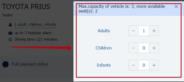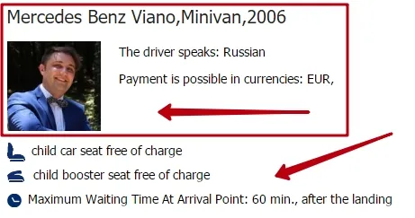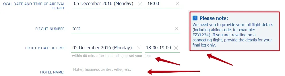 Once you have selected the desired car, our system will go the page of booking and payment for your required transfer, which has an up-to-date new look, complemented with appropriate hints for the user and has the following innovations: