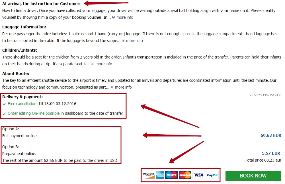 пwhen you click on the "Details & Conditions", all additional important information will be available for you, such as: instructions for customers upon Arrival / departure, luggage & route information, details for free cancellation with dates, payment methods for the transfer, indicating payment systems: