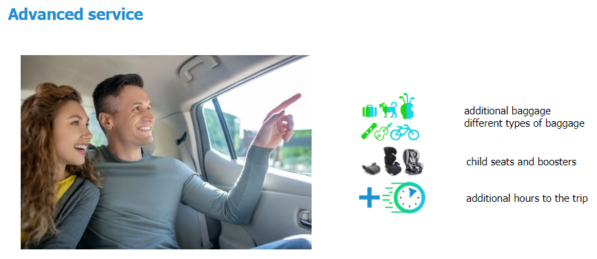 Cool features to upgrade the transfer - extra luggage or pets, child seats and boosters, and extra hours to pick up the keys / shops / stop at attractions.