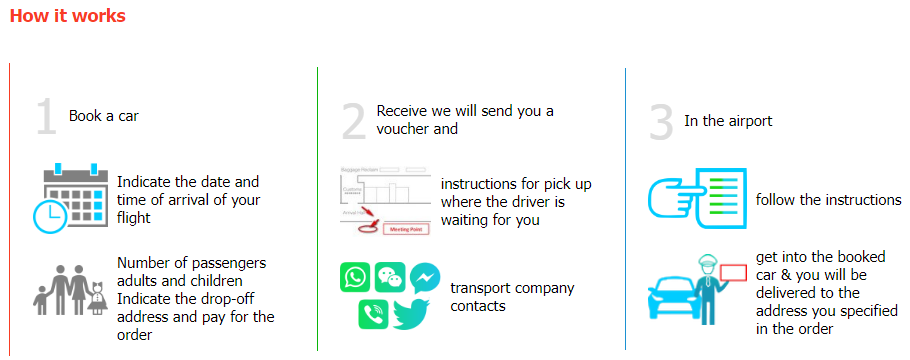 Infographics on how to book a transfer, what will happen after payment and upon arrival to board the car.