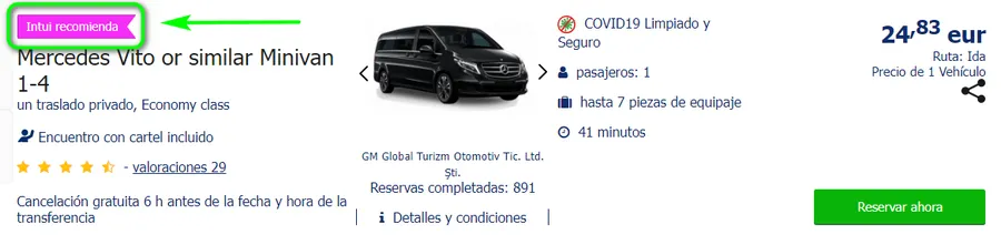 El marcador Intui Recommend marca las ofertas de algunas de las mejores empresas de transporte. Lo mejor en cuanto a calidad de servicio. Confiable y sin quejas. Puede haber varias ofertas de este tipo en la ruta. Recomendamos reservar un coche con Intui ¡Recomienda!