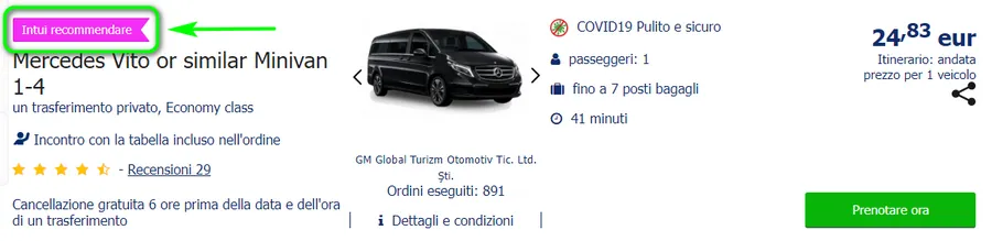 L'indicatore Intui Recommend contrassegna le offerte di alcune delle migliori compagnie di trasporto. Il migliore in termini di qualità del servizio. Affidabile e nessuna lamentela. Potrebbero esserci diverse offerte di questo tipo sul percorso. Ti consigliamo di prenotare un'auto con Intui Recommend!
