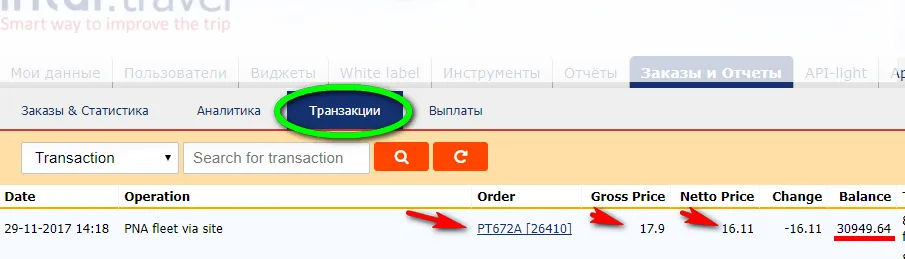 Обратите внимание, что при оплате заказа с партнерского баланса списывается НЕТТО стоимость трансфера.