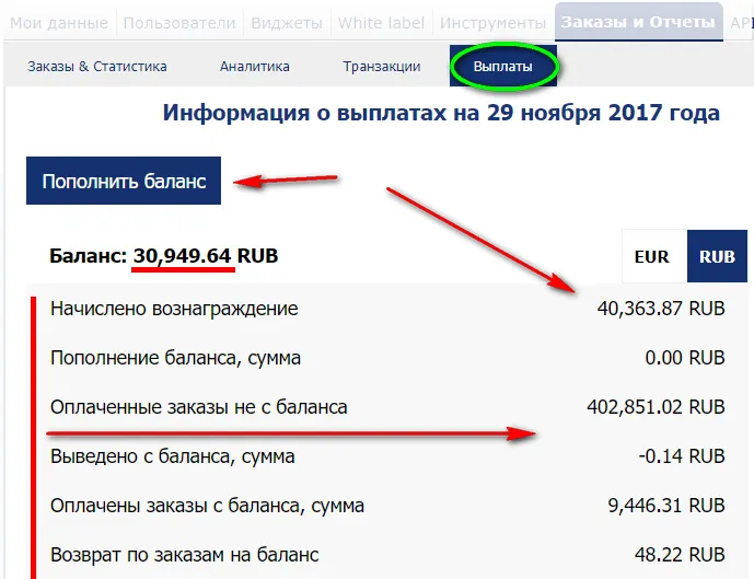 4. Накопленную сумму на балансе можно выводить на реквизиты компании.