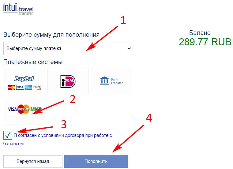 1.Зайти в партнерский кабинет, во вкладке "Мои данные" нажать кнопку "Пополнить",затем выполнить следующие действия