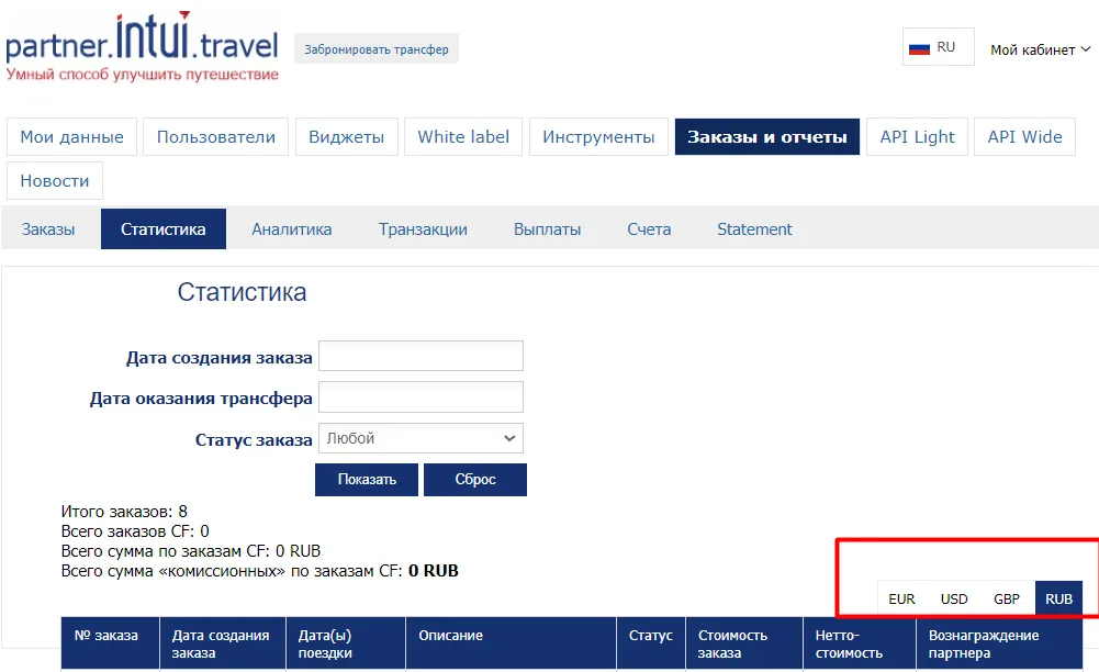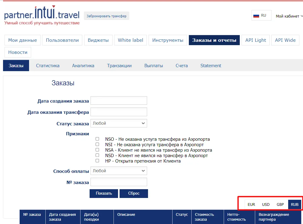 2) В разделе Заказы и отчеты: а) Заказы в ЛК партнера