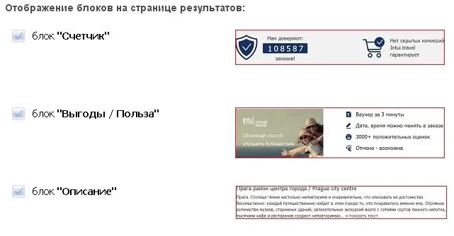 Вы можете произвести настройку дополнительных элементов / блоков - показывать или не показывать их на страницах контента, аэропорта, на страницах результатов поиска. И вот блоки, которые доступны для настройки: