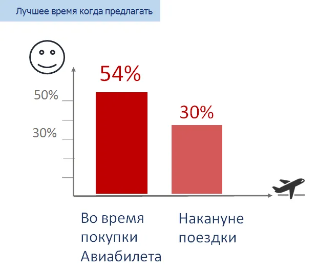 54 % покупателей в он-лайн покупают дополнительные релевантные продукты на фазе бронирования Авиабилета или Отеля (Amadeus. 2015)