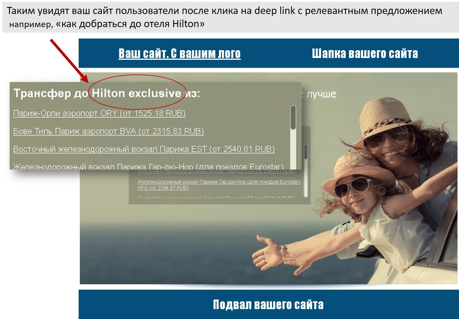 Deep links от нашего API light таргетируют предложения трансферов. Используя deep links вы можете дополнить релевантно трансферами ваши сервисы. C помощью API light рекомендаций вы можете создать deep links релеванто любому контенту:
