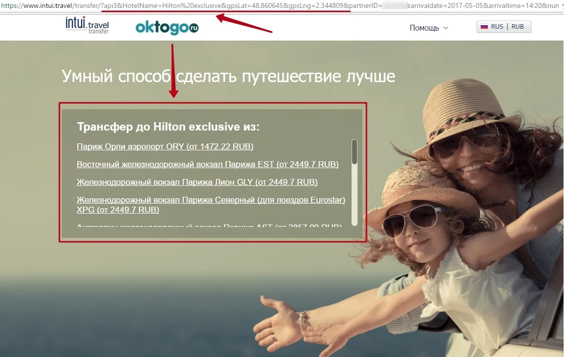 Наш скрипт автоматически проанализирует link с параметрами и откроет релевантное содержание с предложениями трансферов на вашем домене в установленном iframe.