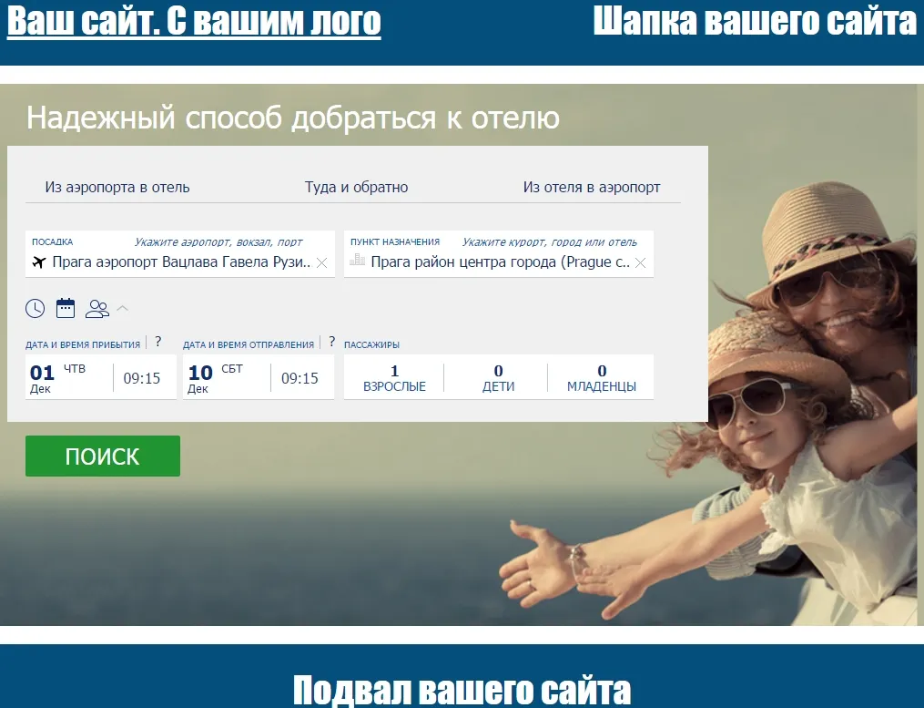 Реализация white label на вашем домене позволяет интегрировать интерфейс бронирования от выбора до оплаты на ваш сайт: шапка и подвал полностью вашего сайта! Таким образом, ваш Клиент совершает бронирование трансферов под вашим логотипом!