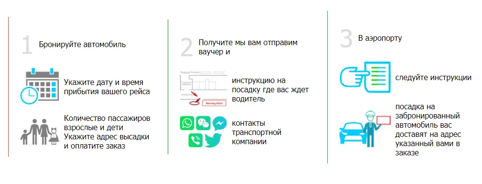 Инфографика о том как забронировать трансфер, что будет после оплаты и по прибытию на посадку в авто.